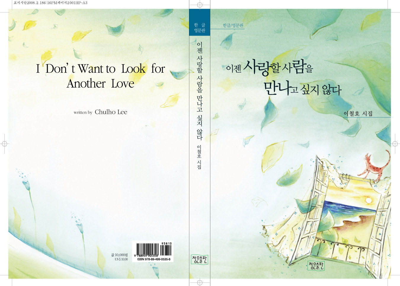 일단 제가 이 작업물을 보고 느낀점을 잠깐 이야기할게요.. 먼저 책의 제목 컨셉트와 일러스트 랑 따로 노는 느낌..입니다. 일러스트나 다른 비쥬얼 이미지는 책의 느낌을 강하게 살리는 분위기로 잡아야 하는 데 비쥬얼쇼크보단 비쥬얼노이즈가 더 강하게 어필된다는 게 일단 제 생각이구요. 이말을 더 자세히 풀면, 타이틀이 통일되어야 겠다는 생각이 들어요. 캘리면 캘리.. 폰트면 폰트, 그리고 디자인 컨셉트도 약간 정리가 되어야 겠습니다. 영문이랑 국문이랑 따로 따로 간다는 게 약간 에러같구요. 이철호 시집에 더 비중을 두느냐, 제목에 더 비중을 두느냐, 는 저자분과 이야기 되어야 겠구요 마지막으로 어퍼스트로피 입력하는 방법도 배우셔야 겠습니다. 이건 쪽지 주시면 알려드리겠습니다.